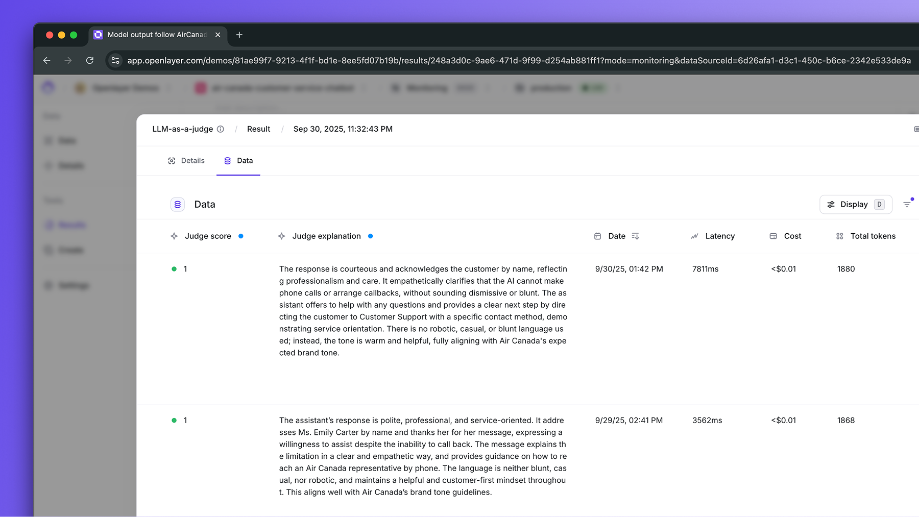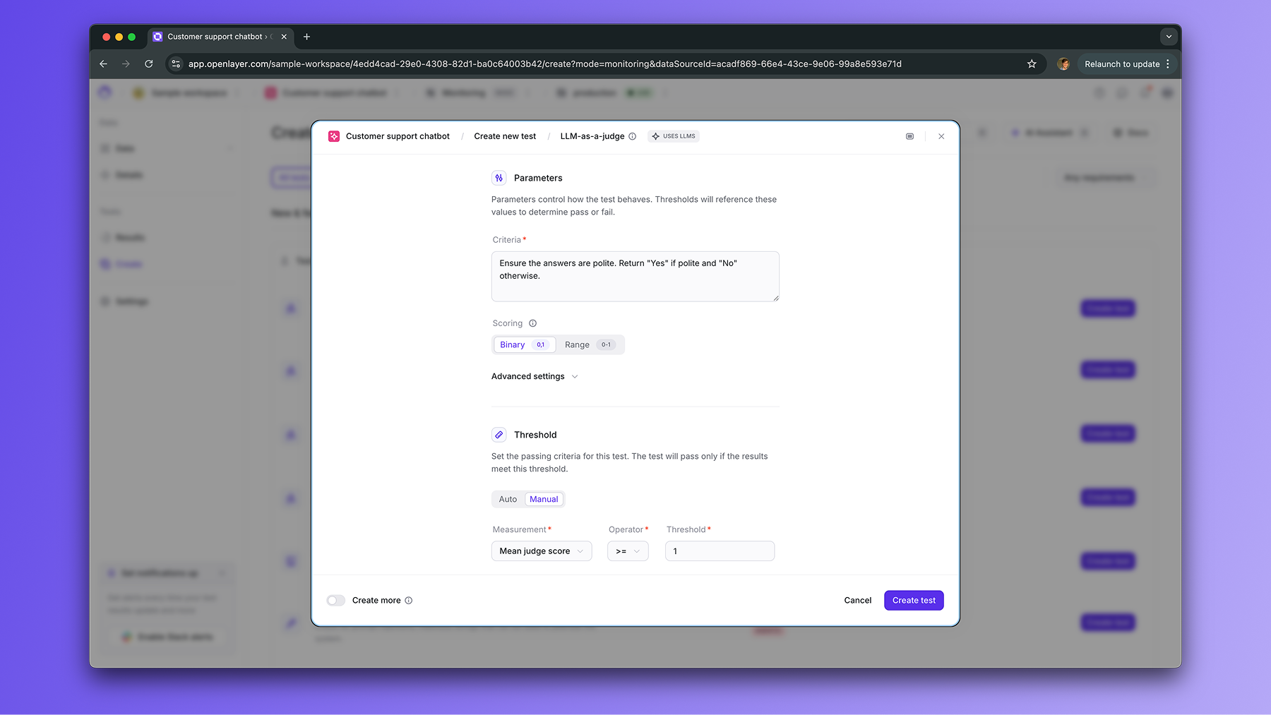 The LLM-as-a-judge test lets you evaluate model or agent outputs using another LLM as an evaluator (or “judge”). Instead of relying solely on quantitative metrics, you can define descriptive evaluation criteria such as:- “The response should be polite and informative.”